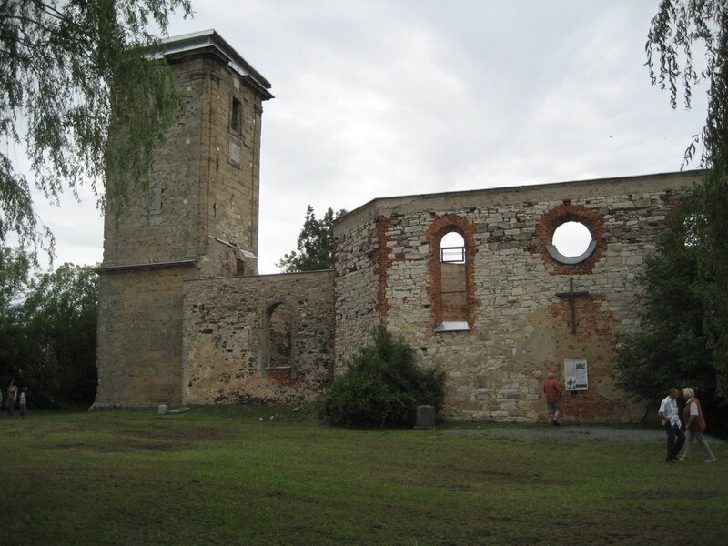 - Ehemaliges Dorf Hopfenohe: Weiter ging die Fahrt zu den Ruinen der Kirche von Hopfenohe. Witterung und frühere Treffer setzten der Ruine stark zu, bis 2004 umfassende Sicherungsmaßnahmen die Überreste vor dem Einsturz bewahrten. In der Nähe des Ortes verläuft die europäische Wasserscheide. Das einstige Hopfenohe galt als eines der ältesten Dörfer der Region.