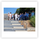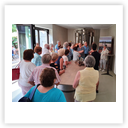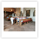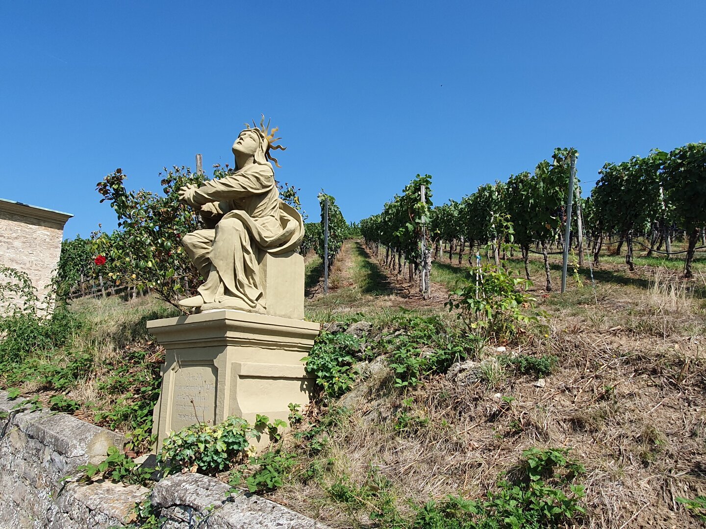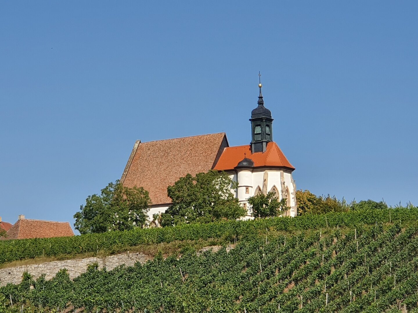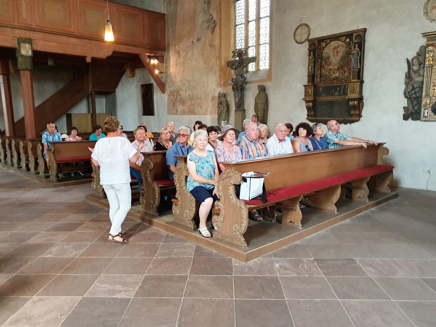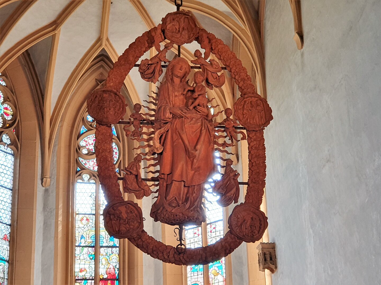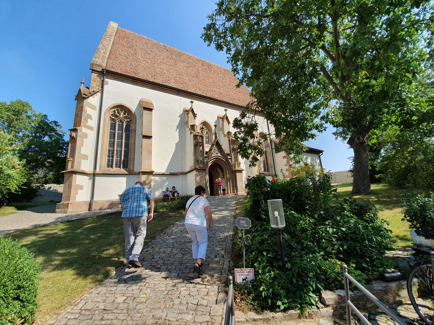 Der erste Höhepunkt des Tages war eine entspannte Mainschleifenrundfahrt, die mit dem Bus in Volkach begann. Das erste Ziel war die Wallfahrtskirche Maria im Weingarten auf dem Volkacher Kirchberg. Umgeben von den Weinbergen des mainfränkischen Weinanbaugebiets beeindruckte die spätgotische Kirche mit ihrer tiefsinnigen Spiritualität. Die handgeschnitzte Pietà aus der Zeit um 1370 zog Gläubige und Besucher gleichermaßen in ihren Bann.