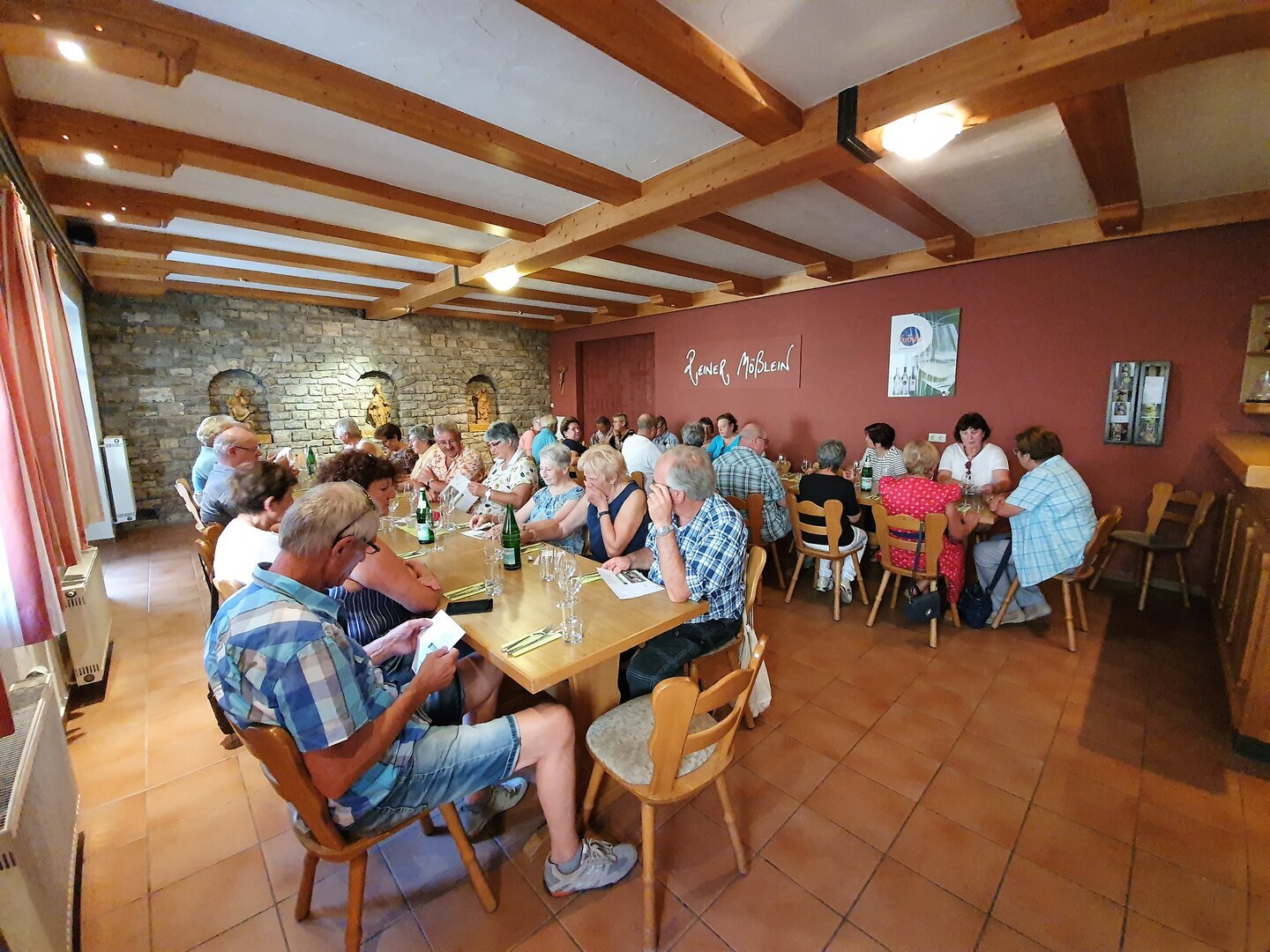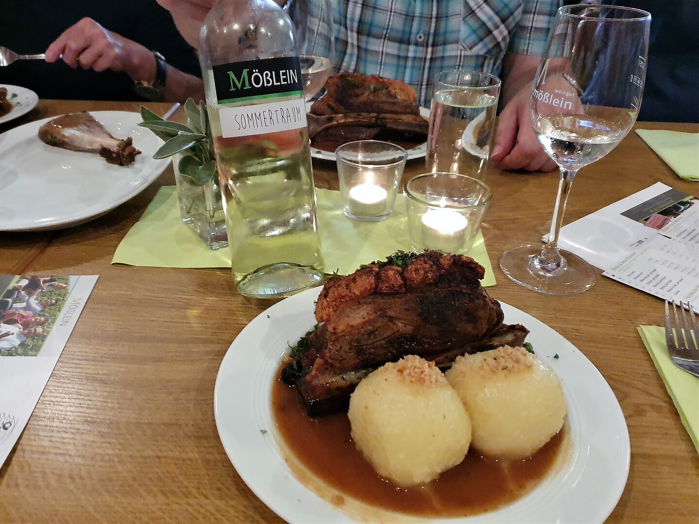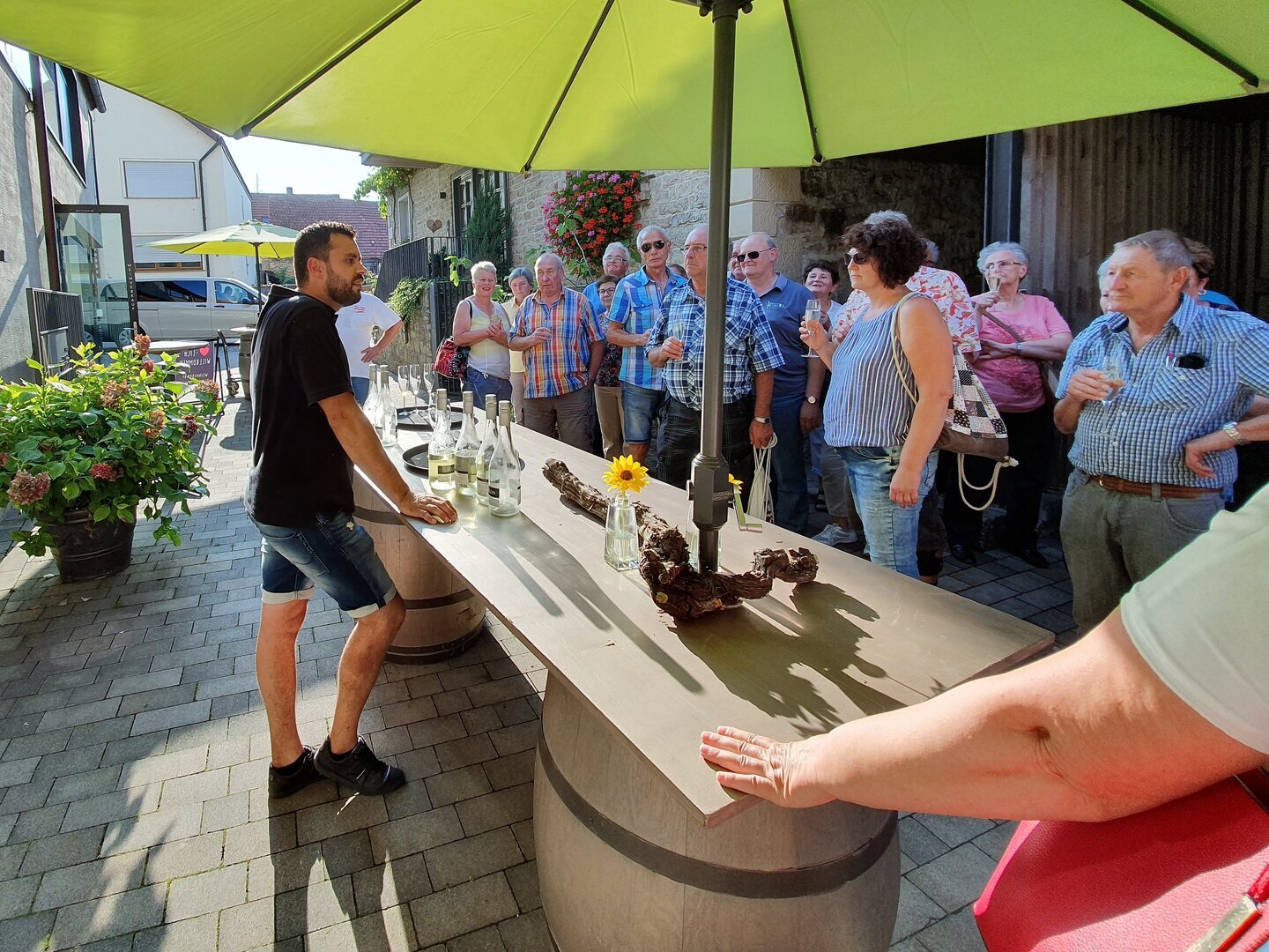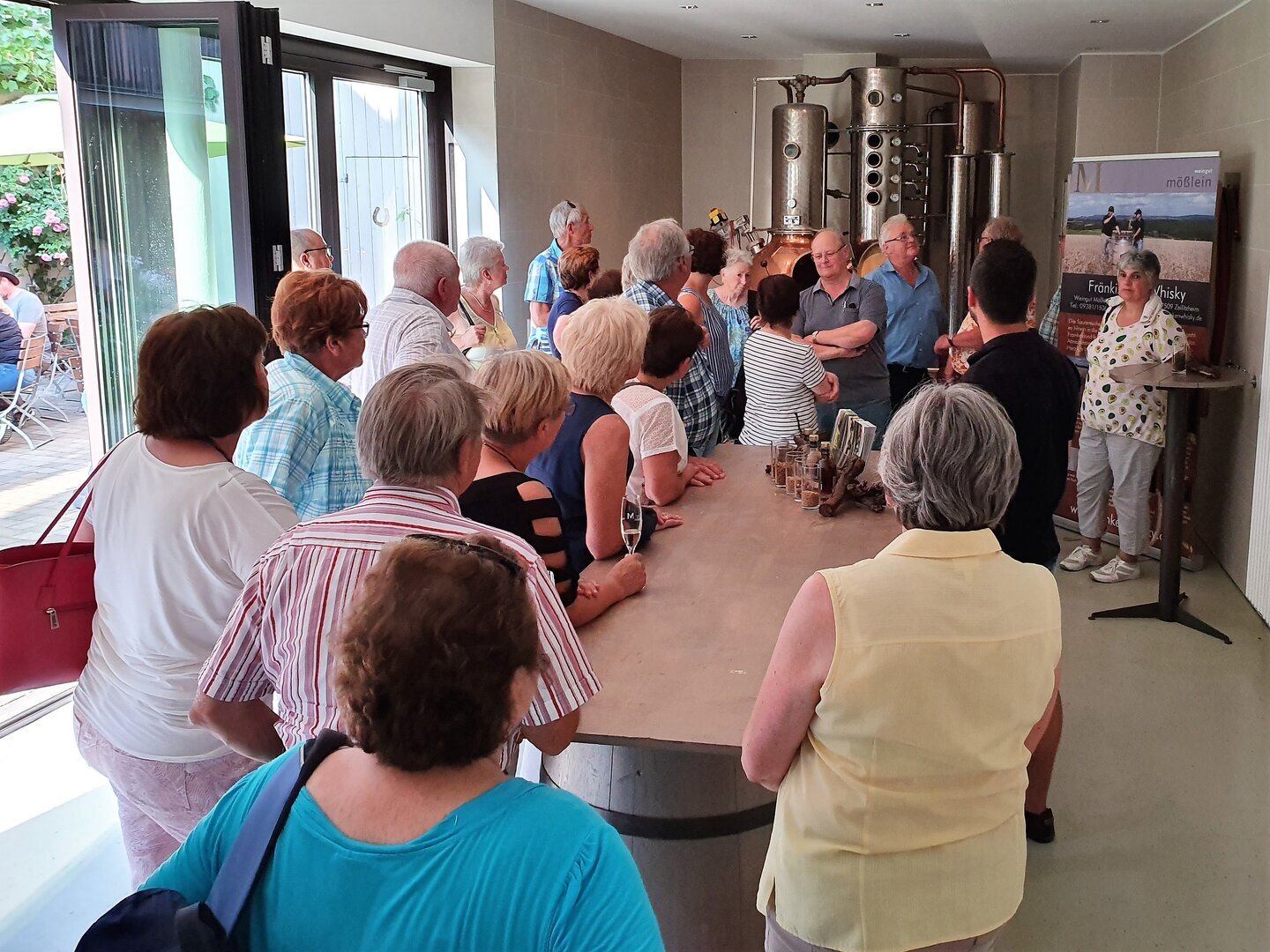 Der Höhepunkt des Tages war zweifellos die Weinprobe im Weingut Mößlein in Zeilitzheim. Im idyllischen Innenhof begrüßte der Juniorchef die Gäste mit einem erfrischenden Glas fränkischem Secco, gefolgt von einer Führung durch das Weingut und die Whisky-Brennerei. In der gemütlichen Weinstube begann dann die Verkostung mit dem "Sommertraum", einem süffigen Weißwein, begleitet von einem knusprigen fränkischen Schäufele mit Klößen und Blaukraut. Fachkundig moderiert von Martin Mößlein wurden weitere köstliche Weine präsentiert, begleitet von interessanten Informationen zur Herstellung und Reifung der edlen Tropfen.