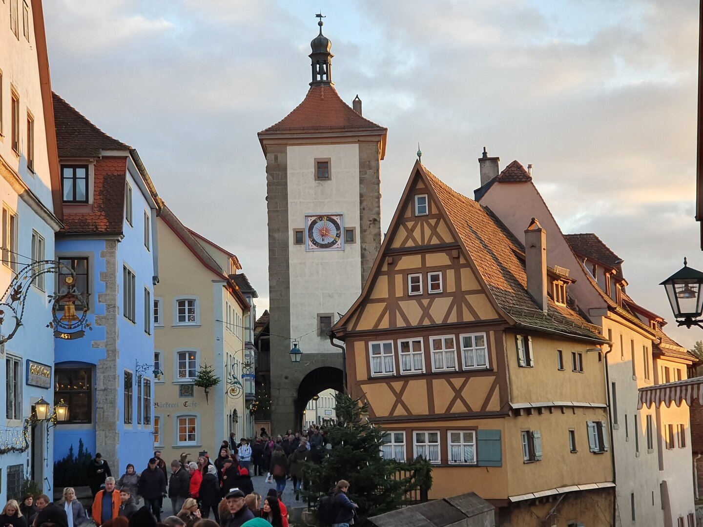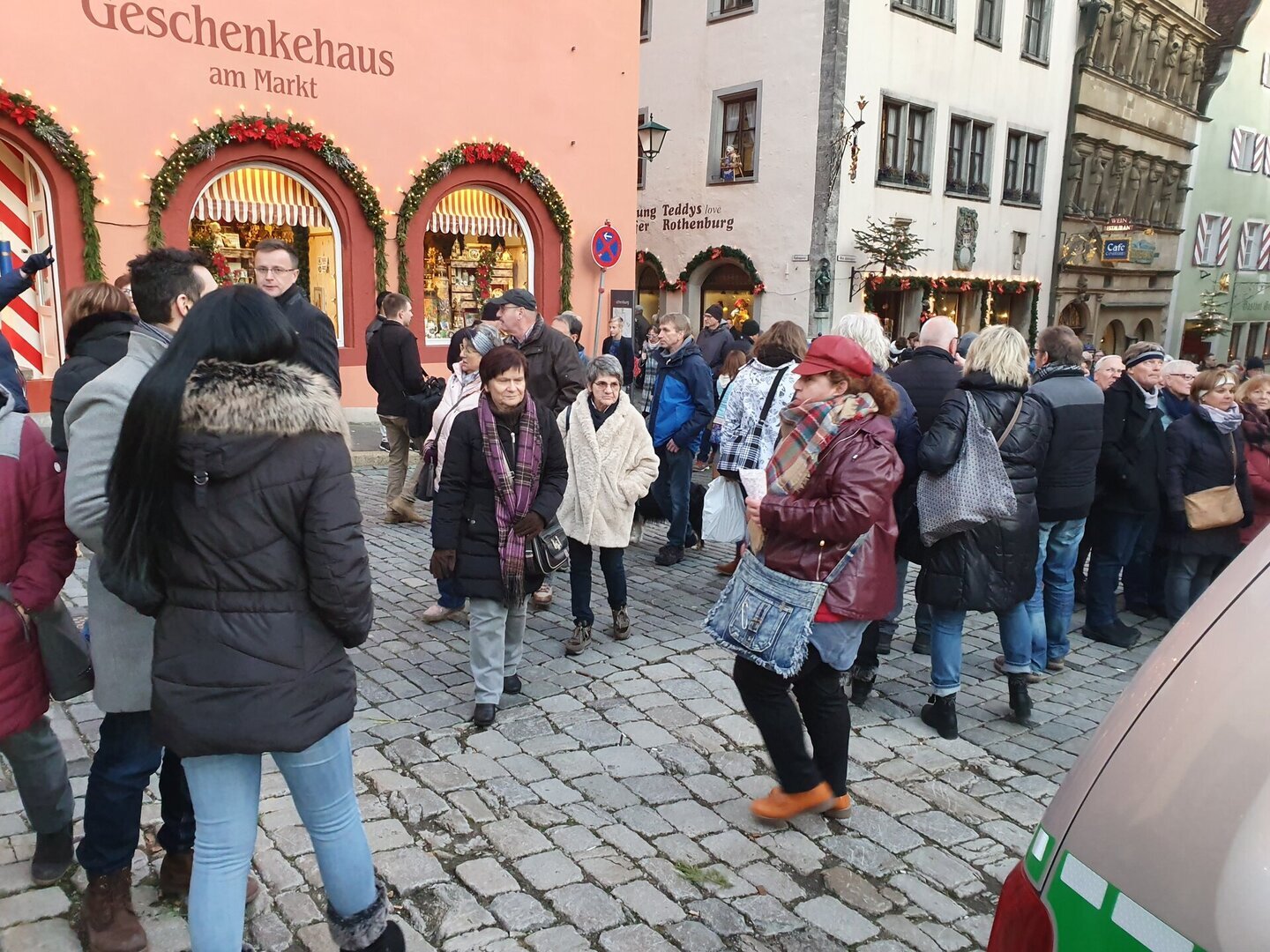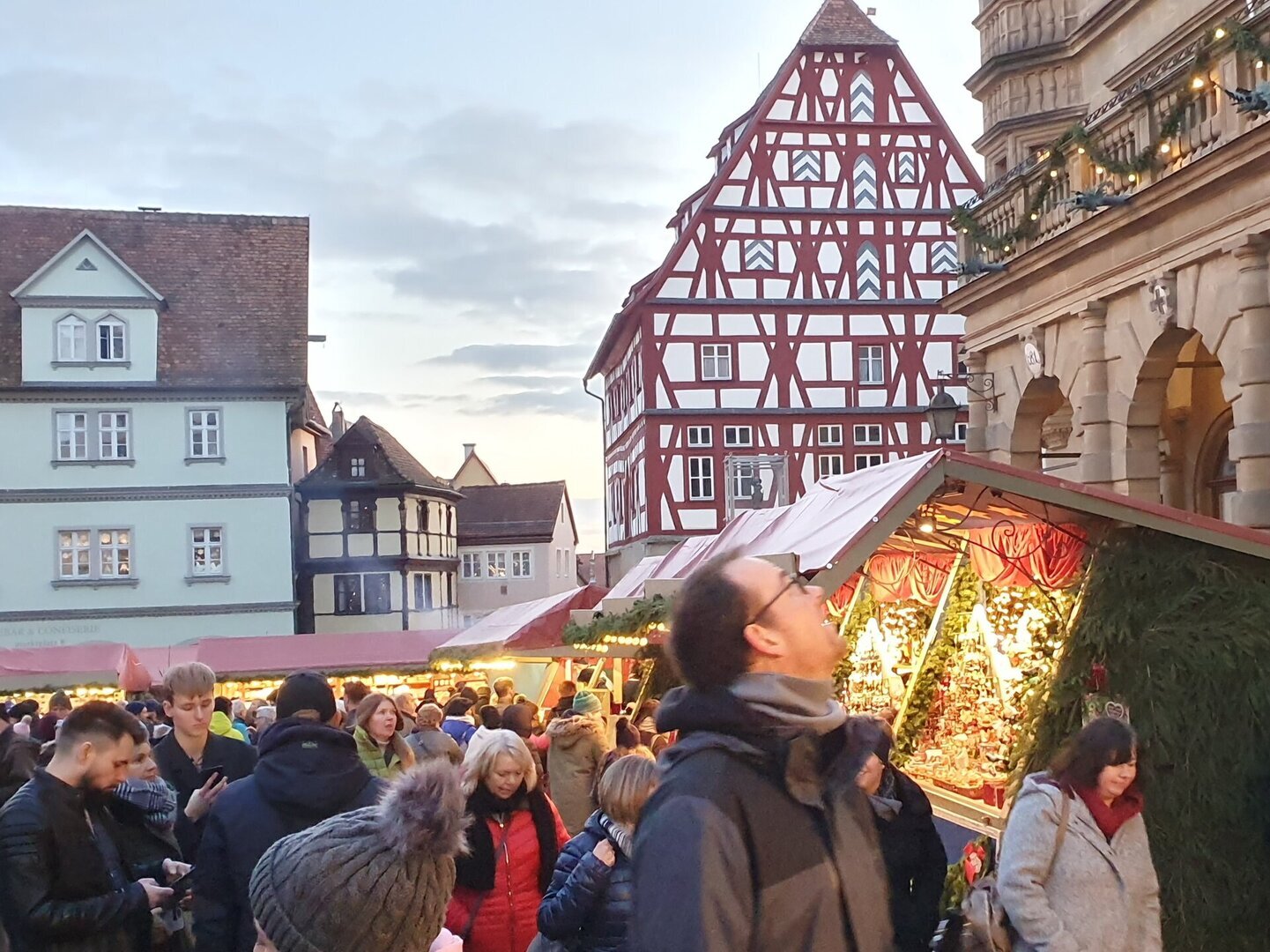 Schon bei der Ankunft war klar: Rothenburg kann nicht nur Mittelalter, sondern auch Märchenbuch! Die Stadt sah aus, als hätte jemand einen riesigen Adventskalender aufgemacht und vergessen, ihn wieder zu schließen. Überall Lichter, Tannenzweige, Girlanden – und mittendrin wir, mit Mütze, Schal und (zum Glück) festen Schuhen auf historischem Kopfsteinpflaster.