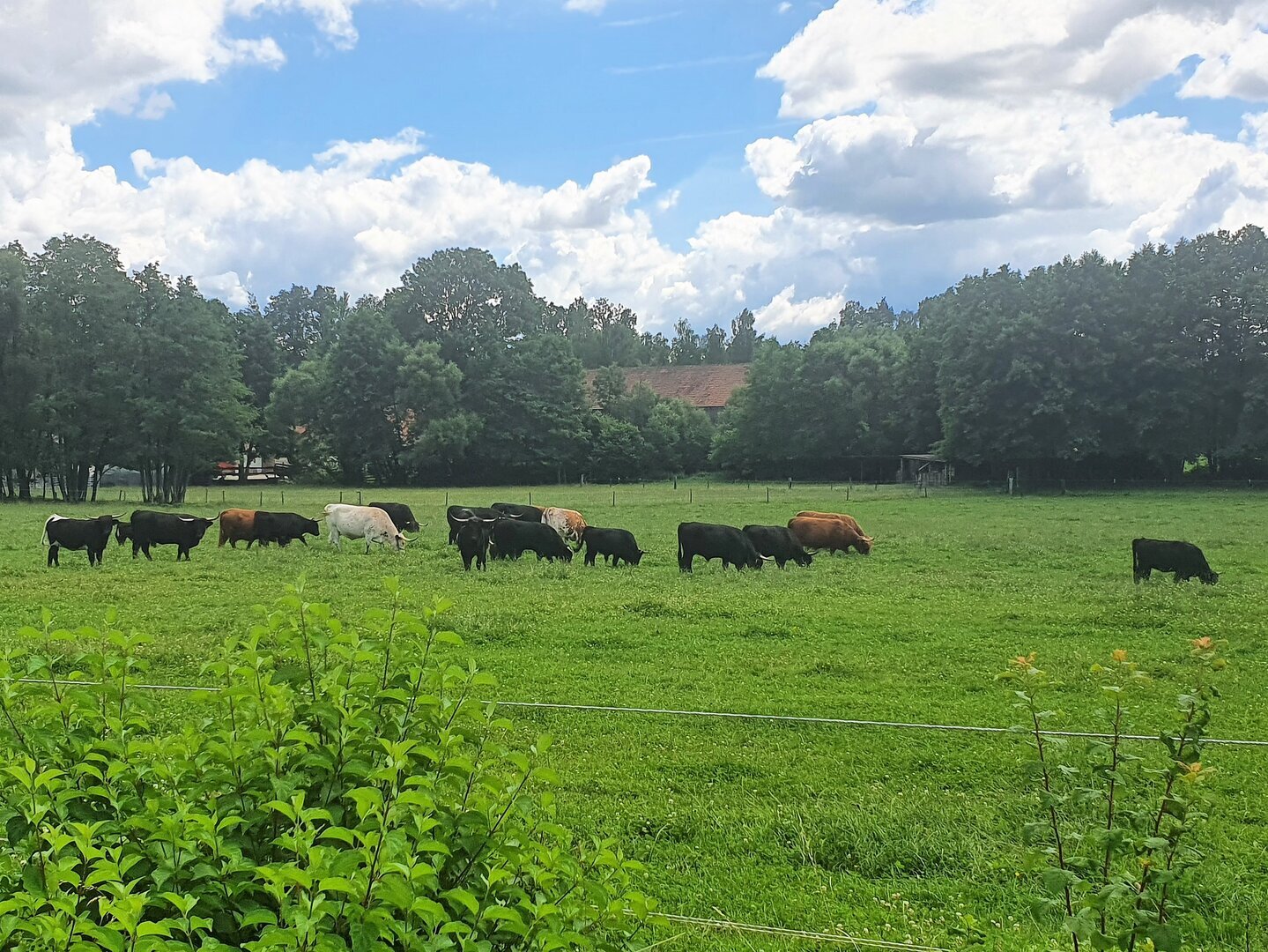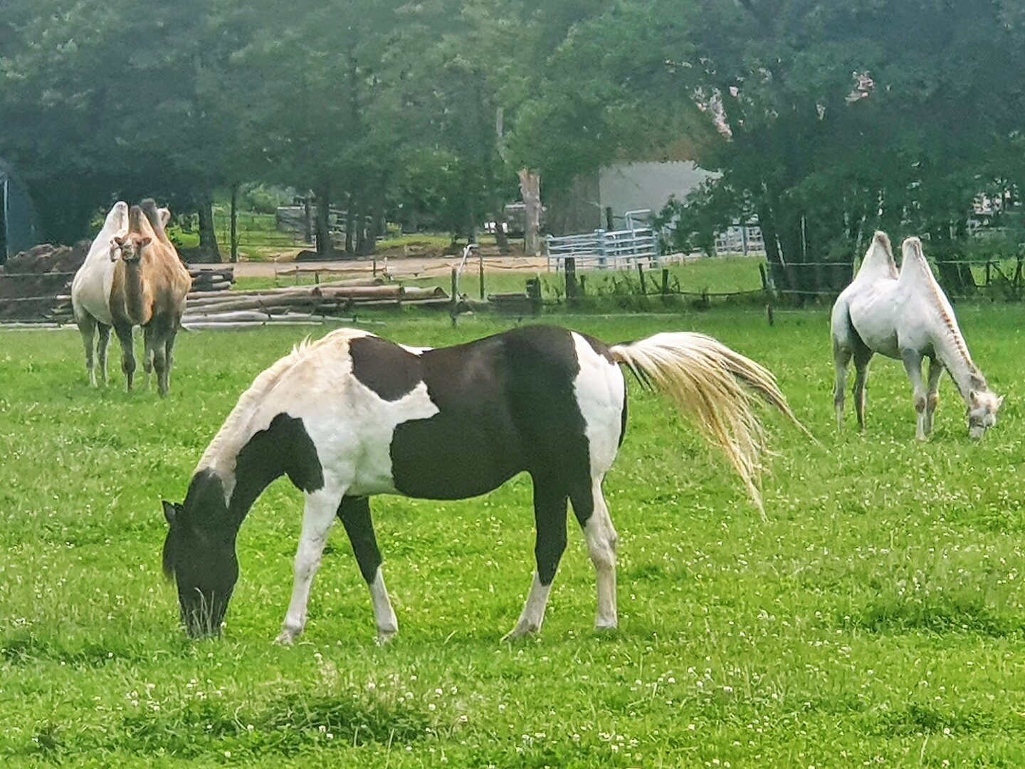 Auf dem Weg zum Bienenhaus begegneten wir einer tierischen Wohngemeinschaft aus Pferden, Highland-Rindern und – kein Witz – Kamelen. Offenbar war’s doch keine Wanderung, sondern ein Überraschungstrip ins Tierreich.