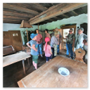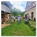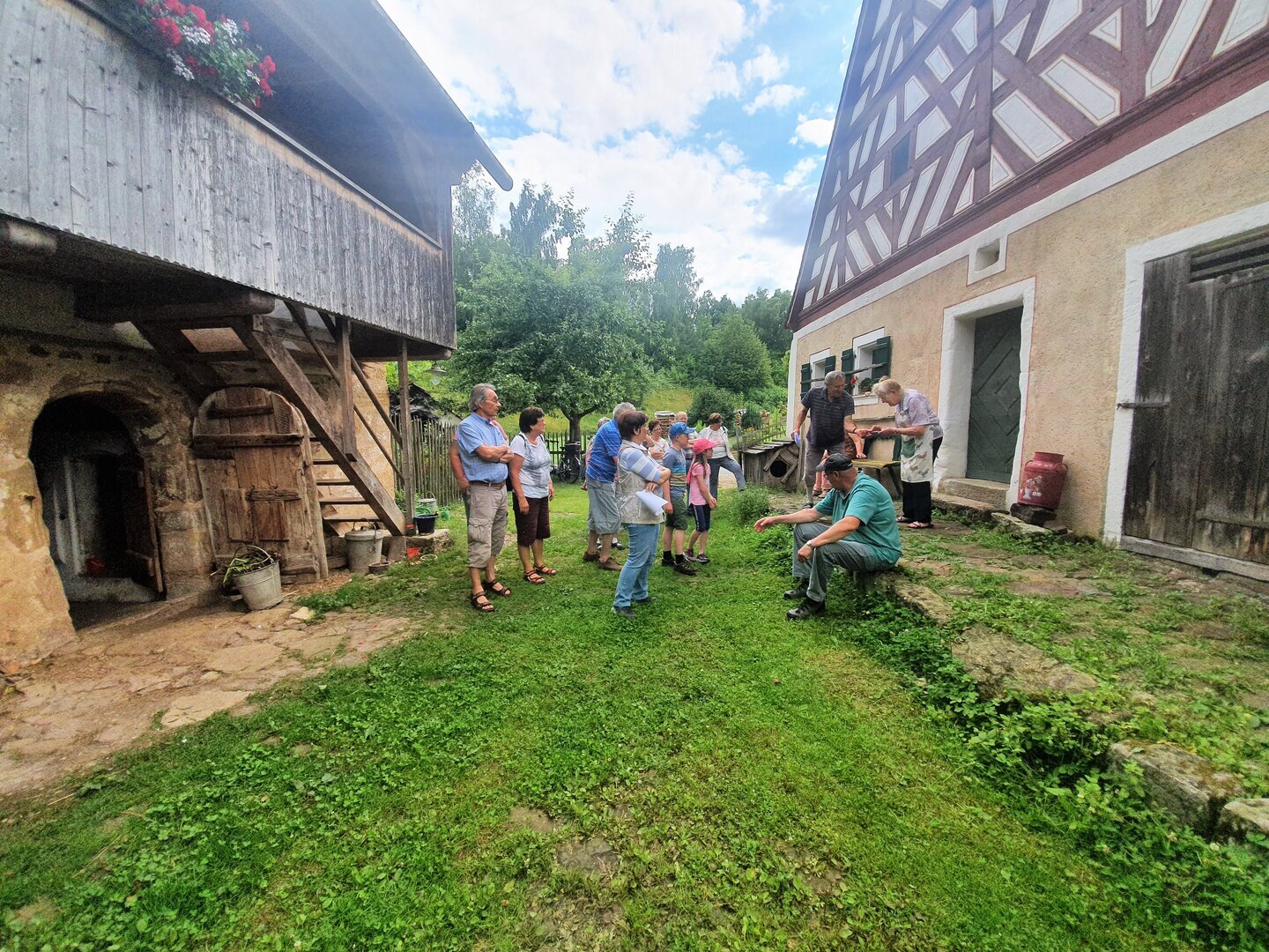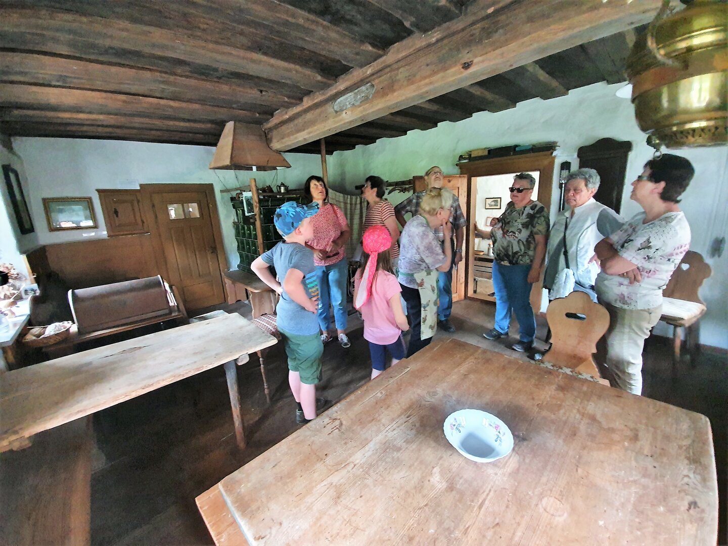 Weiter ging’s zum Goglhof, wo uns Margarete Jäckl in Empfang nahm. Eine Frau wie aus dem Bilderbuch: resolut, herzlich – und vermutlich die Einzige im Umkreis von 100 Kilometern, die freiwillig jahrzehntealte Dachbalken von Hand freilegt.