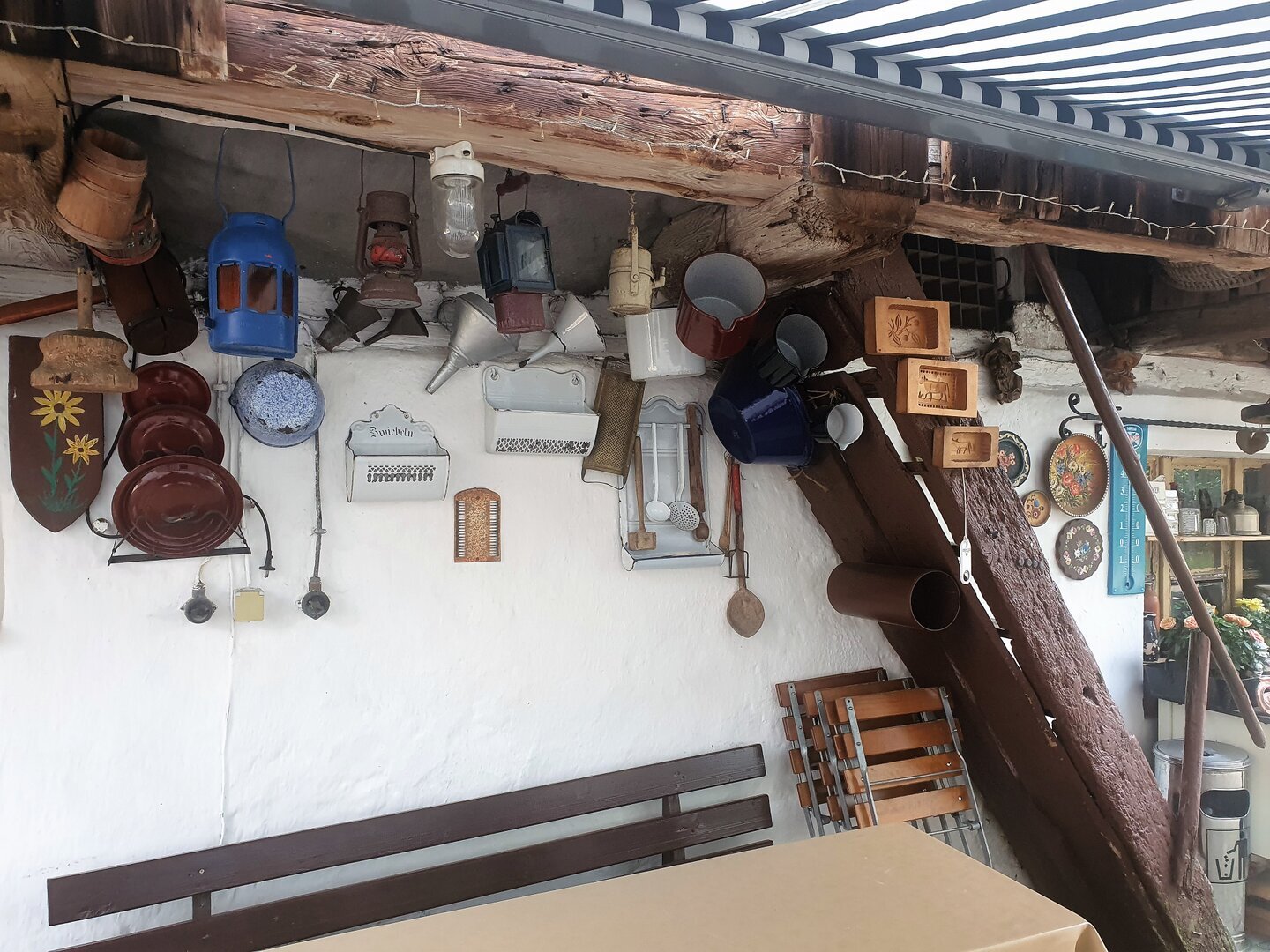 Kaum hatten wir das Wirtshaus betreten, dachten einige von uns kurz, sie wären versehentlich im Museum gelandet. Überall hingen dort Raritäten und Kuriositäten an den Wänden: alte Bauernwerkzeuge, vergilbte Fotografien, Schilder mit verblassten Werbesprüchen und so manches Stück, bei dem man unweigerlich dachte: „Das hatte doch meine Oma auch mal!“ Die Einrichtung wirkte, als hätte man den Dachboden von Generationen entrümpelt und mit Liebe an die Wand genagelt – hier traf Nostalgie auf Gemütlichkeit.