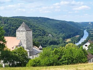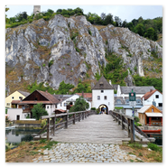 Unser erstes Ziel war Essing. Ein wahres Kleinod im Altmühltal ist der heute noch mittelalterlich anmutende Ort. An die hier steil aufragenden Jurafelsen zwängt sich ein malerisches Häuserensemble, bewacht vom Bergfried der einstigen Burg Randeck. Eine Attraktion: die längste Holzbrücke Europas "Tatzlwurm" über den Main-Donau-Kanal.In Essing stieg dann unsere Reiseleiterin zu und die Tour durch drei Regierungssitze – Oberpfalz, Niederbayern und Oberbayern – begann. Erster Halt war Burg Prunn. Sie steht auf einem steil abfallenden Kalkfelsen, von ihrem Burghof bietet sich ein guter Blick über das Altmühltal mit dem Main-Donau-Kanal. Auf unserer Strecke lag Dietfurt, auch „Bayrisch-China“ genannt. Im Fasching verwandelt sich nämlich die Stadt in „Bayrisch-China“ und aus den Dietfurtern werden Chinesen. Diese wundersame Verwandlung entspricht nicht etwa einer Faschingslaune – der Kämmerer des Eichstätter Fürstbischofs soll einst beklagt haben, dass sich die Dietfurter „wie die Chinesen hinter ihrer Mauer“ verschanzen, weil sie keine Steuern zahlen wollten.