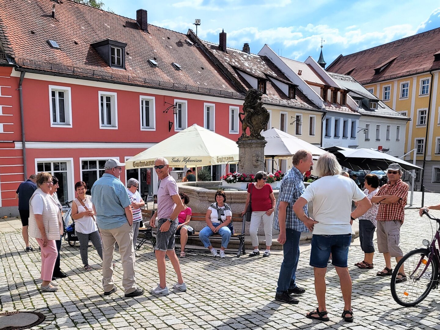 Startpunkt war der Löwenbrunnen, wo die Truppe frisch und fröhlich zusammentraf. Von dort ging’s „mit Elan und guter Laune“ die Bergstraße hinab – stilecht wie bei einem gut geworfenen Neuner. Nach einem eleganten Treppenhops gegenüber der Bäckerei Übler landeten wir an der Stadtmauer und zogen am Biergartenmuseum vorbei. Dort winkte uns – fast wie ein VIP – Erwin Kraus über den Zaun hinweg zu und servierte eine kleine, feine Portion Brauereigeschichte aus dem Boch.