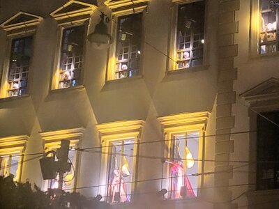 Beim Bummel durch die festlich beleuchteten Gassen entdeckten wir ein reichhaltiges Angebot: von kunsthandwerklichen Artikeln über kulinarische Köstlichkeiten bis hin zu Glühwein in zahlreichen Variationen. Höhepunkt des Besuchs war das berühmte Augsburger Engelesspiel, das traditionell auf dem Rathaus aufgeführt wird. Ein weiterer Blickfang war der Adventskalender am Verwaltungsgebäude, dessen Fenster mit dem Thema „Weihnacht der Tiere: gemeinsam, friedlich und bunt“ geschmückt waren.