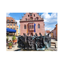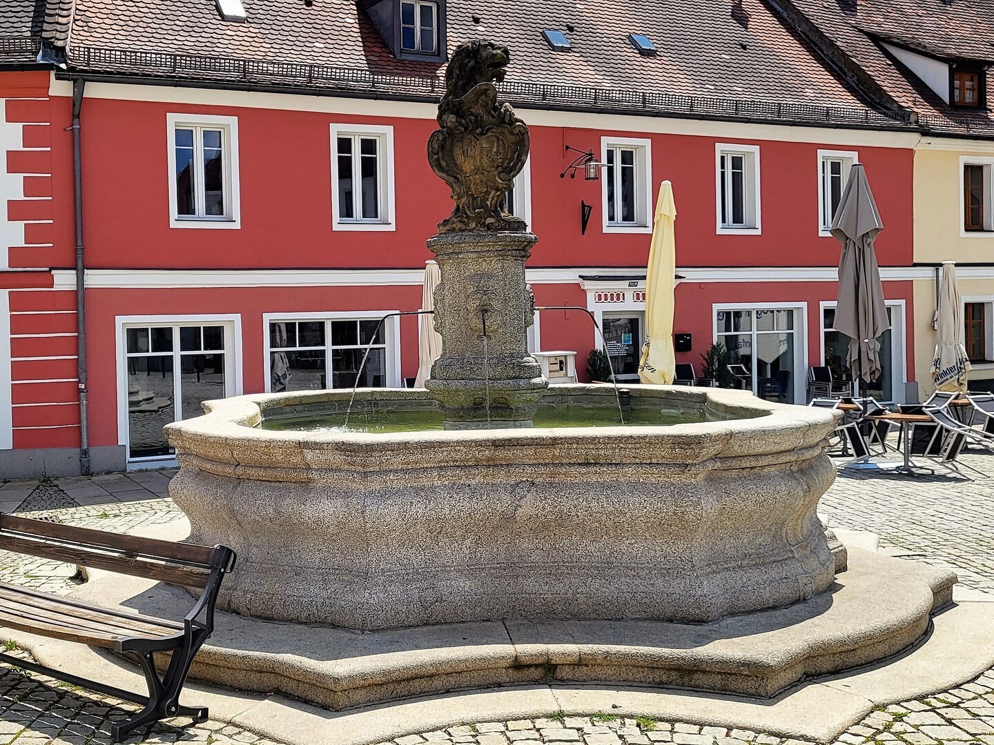 Noch ein paar Schritte und wir kommen wieder zu unserem Ausgangspunkt zurück und stehen jetzt am Löwenbrunnen vor dem Sulzbacher Schloss. Er war einer von drei öffentlichen Brunnen, die 1755/56 unter der Regierungszeit Karl Theodors errichtet wurden. Jetzt haben wir uns eine Erfrischung verdient, sei’s mit einem Kaffee, Eis oder mit einem kleinen Essen und Getränk – oder mit beidem. Gaststätten sind rundum vorhanden.