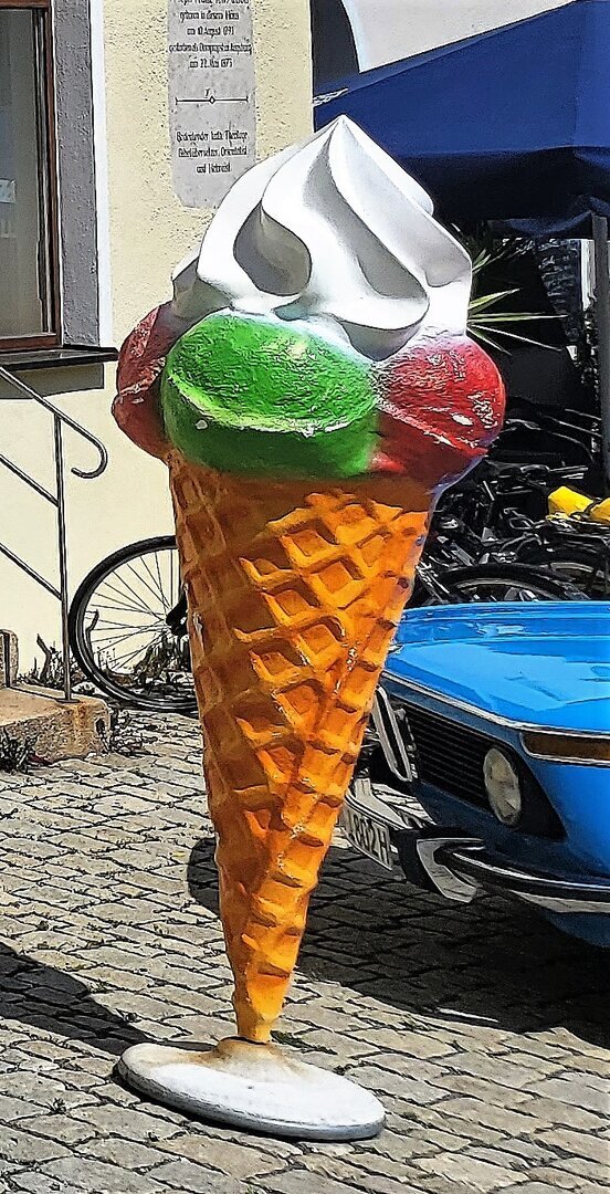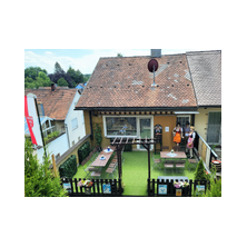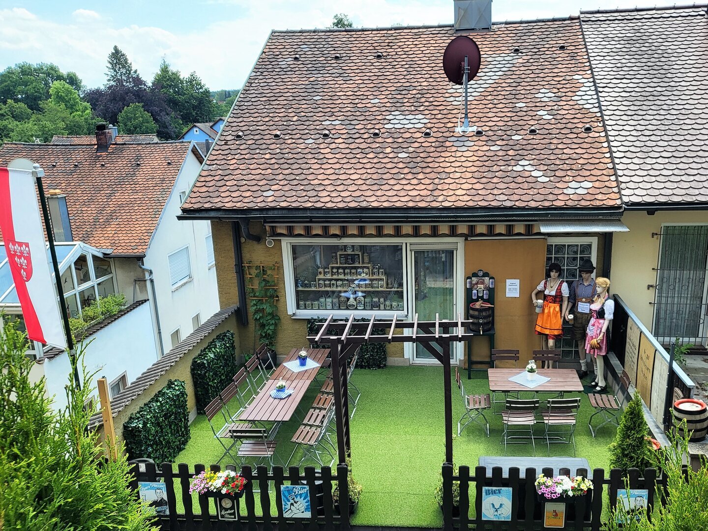 Von hier oben haben wir einen tollen Ausblick auf das „Erste Biergartenmuseum“ von Erwin Kraus – ein Geheimtipp für alle, die die Geschichte des Sulzbacher Bieres wirklich hautnah erleben wollen. Und die Fahne des Museums dreht sich im Wind, als würde sie uns einladen, mehr über diese Geschichte zu erfahren.