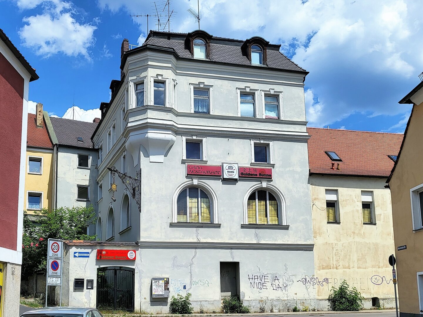 Jetzt biegen wir links in die Bindergasse ein (Namensgebung: Buchdruckerei, Buchbinderei Herbst). Das Eckhaus war früher das „Cafe Heldrich“ und zuletzt das beliebte „Bräustüberl“. Auf der rechten Seite sehen wir Haus Nr. 5 – das Rückgebäude der ehemaligen Druckerei und Buchhandlung J. E. v. Seidel, am Ende der Straße links die ehemalige jüdische Druckerei, dann das Rentamt, von 1939–70 Landratsamt.