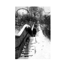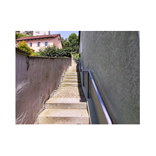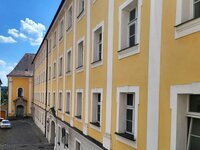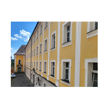 Kurz auf der Fahrstraße, dann geht es gleich rechts und über eine weitere Treppe auf einen Fußweg, der uns unterhalb der Klosterkirche, der ehemaligen Kaserne (jetzt Polizei) und der Schlossanlage entlangführt.