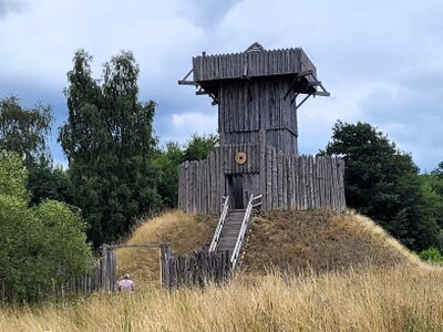 In einer zweiten Siedlungsgruppe erinnert der Park an die Christianisierung der heidnischen Slawen im 11. Jahrhundert. Diese wird symbolisiert durch eine 15 Meter hohe Turmhügelburg, eine Kirche sowie das Wohngebäude des Ministerialen. Ministeriale waren eine Art adeliger Verwalter, die das Reich zur Befriedung einsetzte.Interessantes Detail: Die Kirche ist die Rekonstruktion eines Gotteshauses aus dem Landkreis Kitzingen. Sie war der hölzerne Vorgängerbau der späteren Kirchenburg Kleinlangheim, der auf das 11. Jahrhundert zurückgeht. Wie das Vorbild ist der Nachbau 11 mal 6 Meter groß. Die Stabbauweise erinnert an die skandinavischen Kirchen, wie sie heute zum Teil noch stehen.