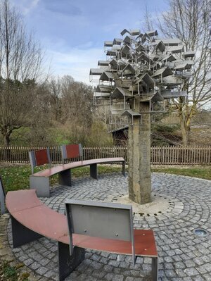 Vom Talgrund aus geht es auf der anderen Talseite sofort wieder bergauf nach Viehberg. Von der Dorfmitte aus machen wir einen kurzen Abstecher nach rechts und stehen nach 200 m vor dem Viehberger Lebensbaum (km 13,1), ein aus verschiedenen Materialien errichteter Kunstbaum von Sabine Mädl, einer aus dem Nachbarort Kotzheim stammenden Künstlerin. Er soll das Wachsen des ursprünglich aus nur sechs Häusern bestehendem Dorf symbolisieren. Zurück am Dorfplatz radeln wir bis zum Wegweiser nach Weiherzant, dem wir nach links folgen. In Weiherzant sofort scharf nach rechts.