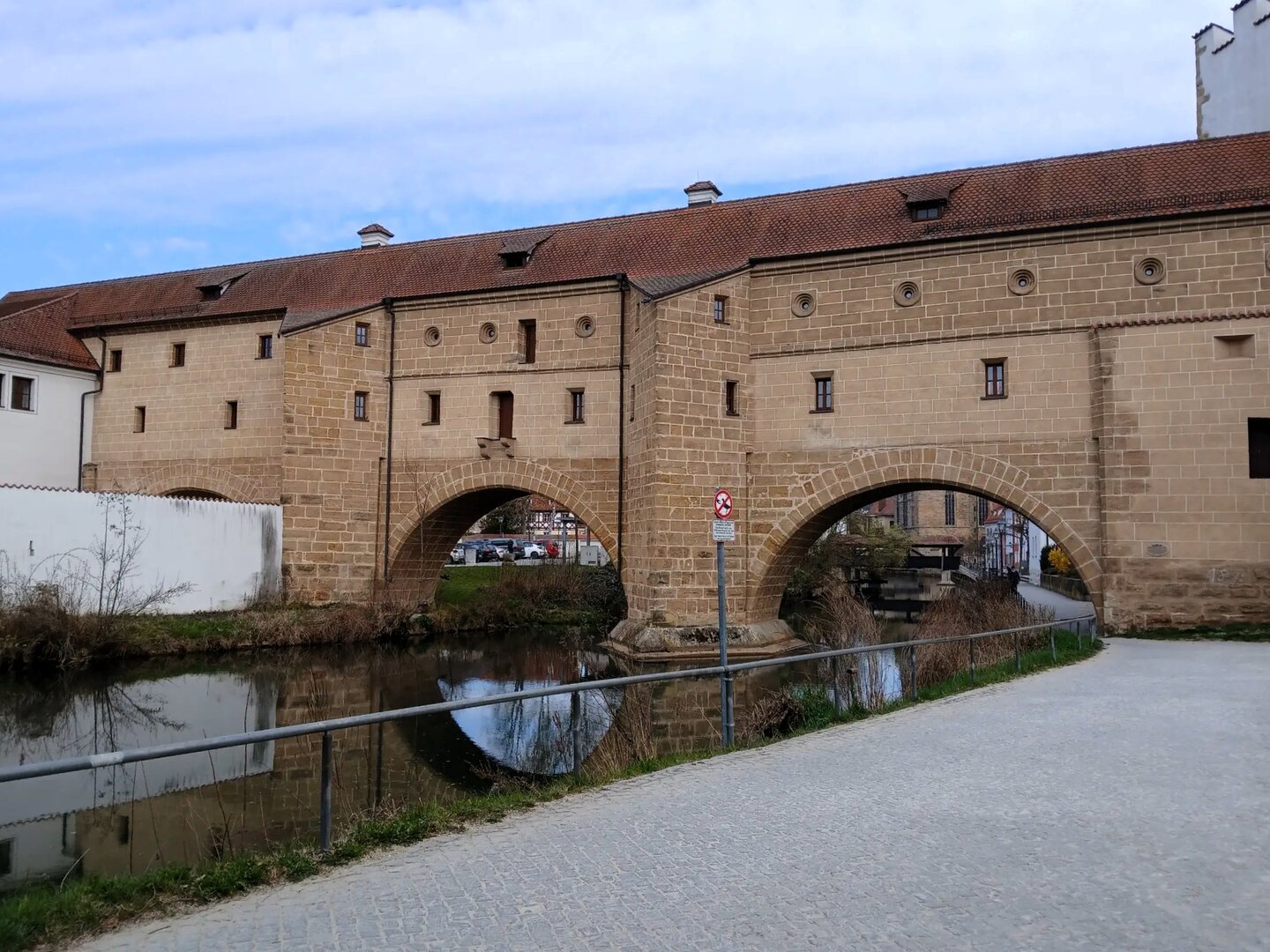 Von der Nepomukstatue hinterm Sulzbacher Feuerwehrhaus radeln wir nach Rosenberg. An der Ampel bei Blumen Pürzer geht es nach rechts. Nach dem Wertstoffhof links auf die Erzhausstraße und 150 m weiter wieder links auf den Fuß- und Radweg am ehemaligen Kühlturm der Maxhütte vorbei. Bald befinden wir uns an der Europastraße, zweigen aber am Autohaus nach rechts ab (bei km 4,9) auf die Lohestraße (AS 35).Ihr folgen wir auf dem Radweg über Poppenricht und Witzlhof nach Amberg. An der 2. Ampel (km 12,5) links und dem grünen Pfeil folgend etwas zickzack entlang der Stadtmauer am Bahnhof vorbei bis zur Vils (km 14,1). Unterwegs sind das Ziegeltor, das Nabburger Tor und immer wieder die Stadtmauer sowie die Silhouette der Stadt und schließlich an der Vils die Stadtbrille einen Blick wert.