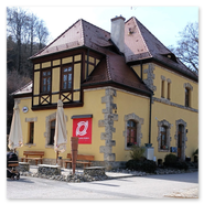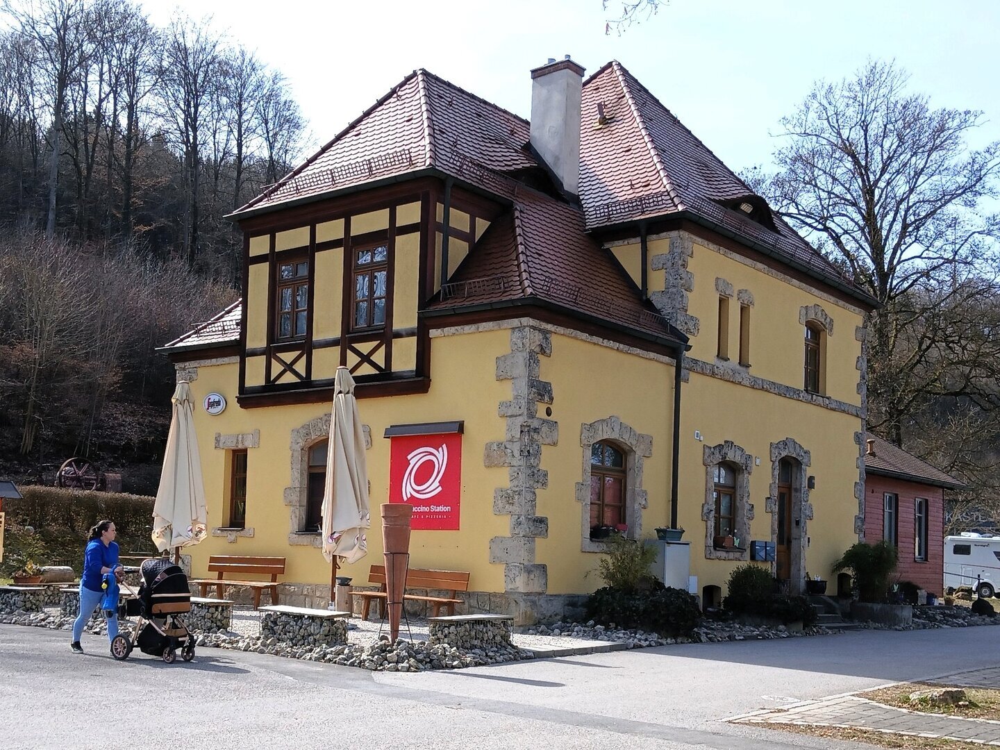 Das volle Panorama der „Perle des Lauterachtals“ erschließt sich, wenn wir Kastl auf der Hohenburger Straße verlassen und nach ca. 300 m vor Hausnummer 20 rechts über die Lauterach zur ehemaligen Bahnstation radeln. Hier eröffnet sich ein herrlicher Blick auf die imposante Klosterburg. Infotafeln erzählen von der Geschichte der Bahnlinie Amberg–Lauterhofen und des Wandergebiets.