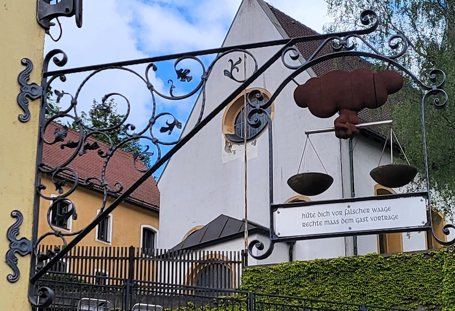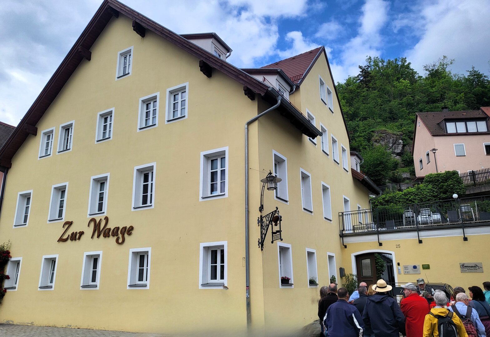 Dann ging’s zum ehemaligen Rathaus – einst mit Glockenturm, heute eher turmlos, aber dafür geschichtsträchtig. Gegenüber: das legendäre Gasthaus „Zur Waage“. Seit 1683 wird hier ausgeschenkt – und wahrscheinlich auch schon länger erzählt, gesungen, gelacht. Und ja: Das Bier kam einst aus dem Brauhaus des Hofrats von Korb. Wer in Rosenberg durstig war, musste kein König sein – es reichte ein Krug.