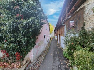 Die Pfarrgasse lockt nach links, die Lange Gasse nach rechts – und plötzlich stehen wir mitten im Postkartenmotiv: Stadtmauer, Fachwerk, kleine Häuser, große Geschichte. Wir grüßen den Grünthaler-Turm (benannt nach dem Stadtheimatpfleger von 1990 bis 2000) und werfen durch eine Tür einen Blick auf den Drachenpfad im Stadtgraben – ein Muss für kleine Abenteurer und große Stadtromantiker.