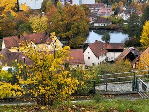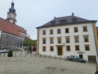 Rechts von uns erstreckt sich die Neustadt, einer der historisch interessantesten Stadtteile Sulzbach-Rosenbergs, der vom Stadtbrand 1822 verschont blieb. Hier finden sich neben dem Schlossareal die ältesten Baustrukturen – sie reichen bis ins Mittelalter zurück.