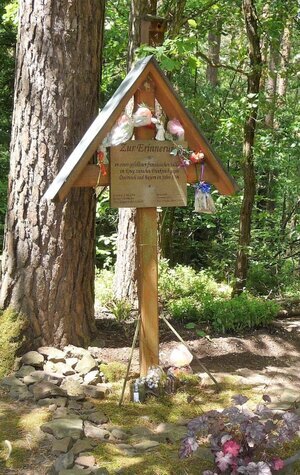 Einige tiefe Hohlwegstellen deuten darauf hin, dass es sich hier um eine Altstraße handelt, die von Sulzbach, über den Altort Großenfalz, nach Großalbershof und Iber führte.[vii]Beerdigt ist dort niemand. Es ist nur eine Gedenkstätte für einen französischen Soldaten, der im Krieg von Frankreich gegen Österreich und Bayern 1796 gefallen ist. So steht es auf dem Schild unter dem Kreuz. Sie wurde 1994 durch das Stiber-Fähnlein, unter dem unvergessenen Vorsitzenden Klaus Faltenbacher errichtet. 2015 wurde sie – erneut durch das Stiber-Fähnlein - restauriert. Erstaunlich ist, dass trotz der abgeschiedenen Lage eine Blumenschale dort steht, die offensichtlich regelmäßig gegossen wird. Irgendjemand kümmert sich also darum.