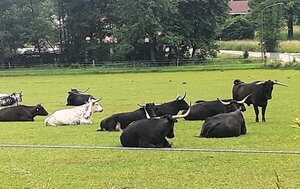 Auf dem Weg nach Süß haben wir die Wahl zwischen der Straße oder dem Bohlenweg des Naturerlebnisweges. Es empfiehlt sich, langsam zu fahren und einen Blick in das sumpfige Gebüsch entlang der Vils zu werfen. Mit etwas Glück entdecken wir sie, die Neubürger der Marktgemeinde, nämlich vier grasende Wasserbüffel. Sie fühlen sich offensichtlich wohl und danken für die Gastfreundschaft mit fleißigem Kurzhalten der sonst zu stark wuchernden Weiden. Freilich kann es auch sein, dass sie faul wiederkäuend ein wenig versteckt da liegen.