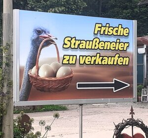 In Holnstein fahren wir in der Ortsmitte zuerst links Richtung Schloss und vor dem Gasthof „Weisses Ross“ nach rechts. Beim letzten Haus biegen wir links ab, am Spielplatz rechts und an der nächsten Gabelung wieder links, überqueren die Straße und fahren bergab nach Haghof. Danach geht es links weiter und nach weiteren 300 Metern wieder rechts. Nach etwa 700 Metern erreichen wir den Blechhof, wo ein Schild Straußeneier zum Kauf anbietet. Hinter dem Hof entdecken wir die Erzeuger dieser Eier – mehrere Strauße, die ursprünglich aus Afrika stammen.