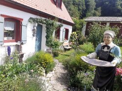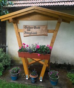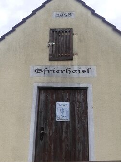 Am „Gfrierhaisl“ geht es rechts und dann halb links etwa 2 km durch das Trockental. Am Ende der asphaltierten Straße biegen wir rechts ab. In Eckertsfeld fahren wir geradeaus weiter bis Frechetsfeld (km 14,4), dort links ab und weiter für anderthalb Kilometer. Am Ortseingang von Hainfeld biegen wir links ab und durchqueren den Ort, wo uns eine Attrappe eines Bäckers mit leider leerem Brotbrett begrüßt. Danach geht es leicht links
